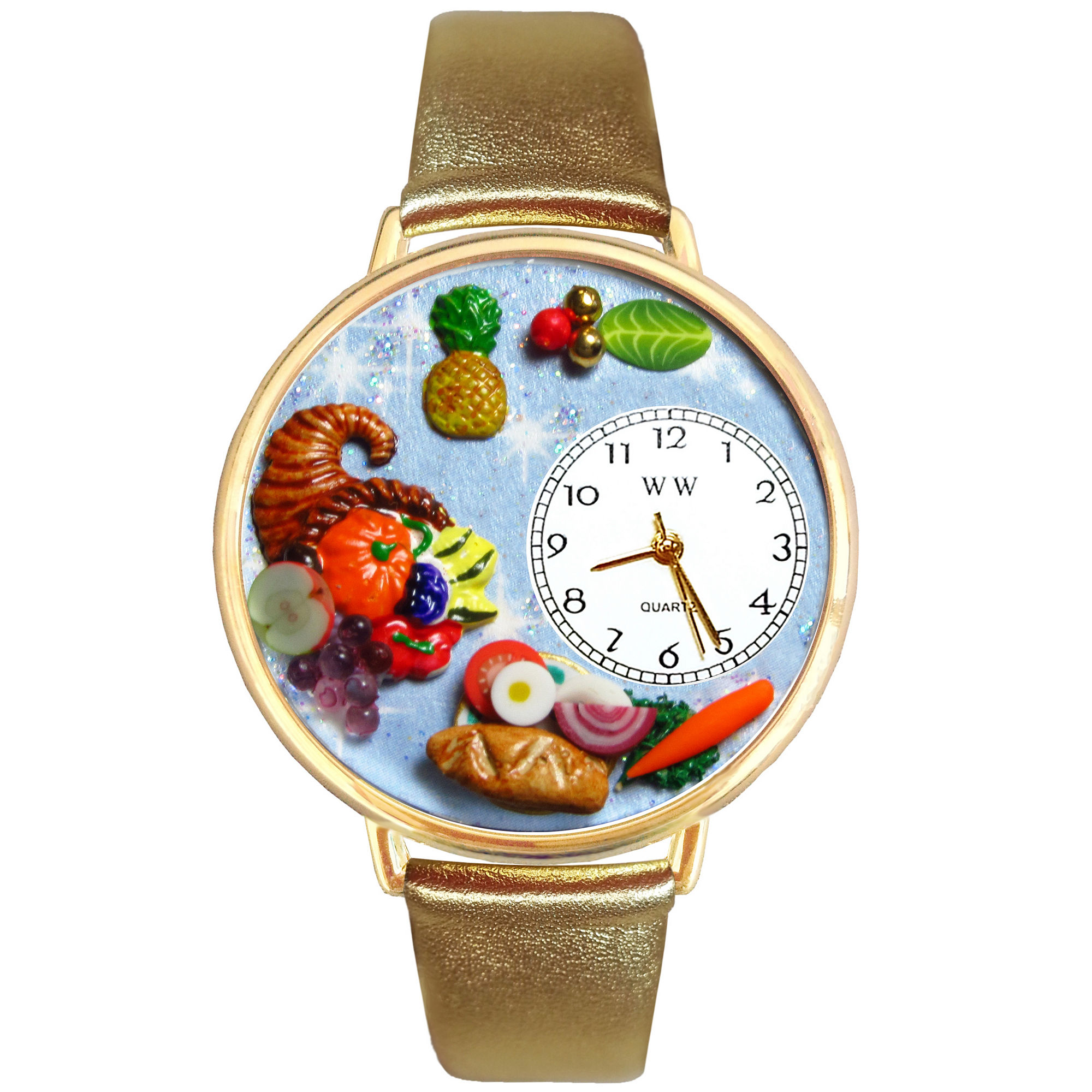 Your holiday is now complete with this tan leather strap watch and its cornucopia of yummy food on the dial