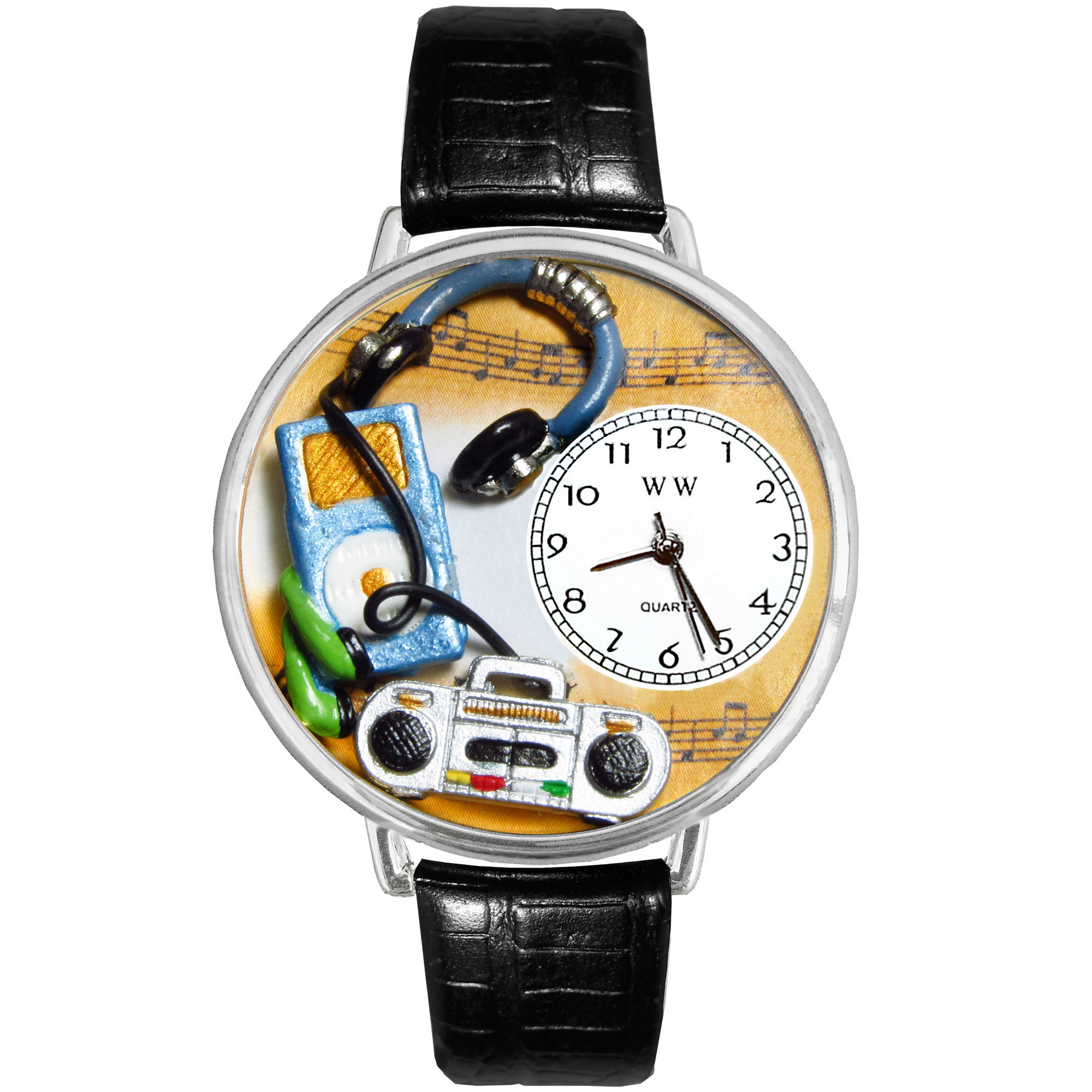 Whimsical Watches Personalized Music Lover Womens Silver-Tone Bezel Black Leather Strap Watch