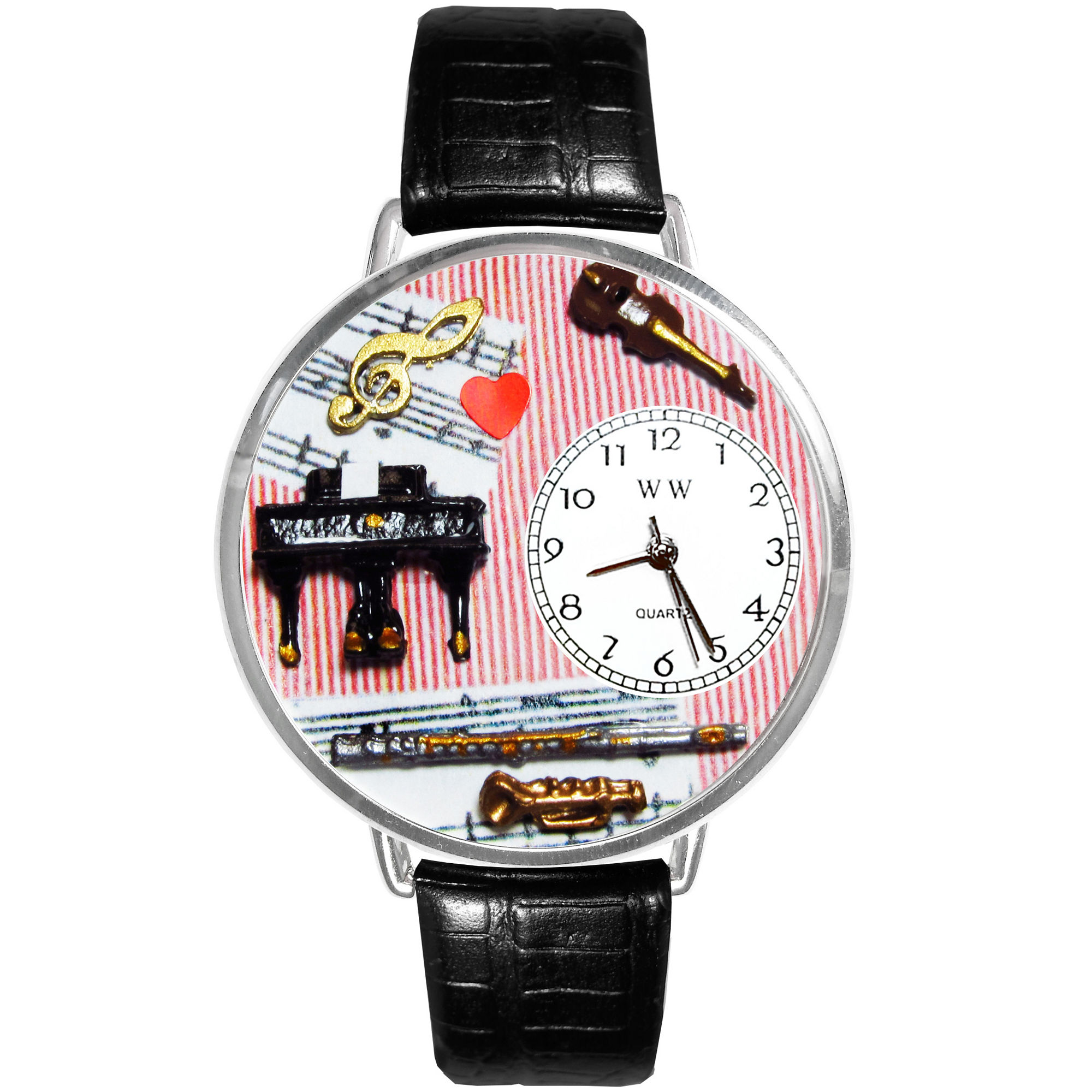 The dial is adorned with a piano, violin and trumpet